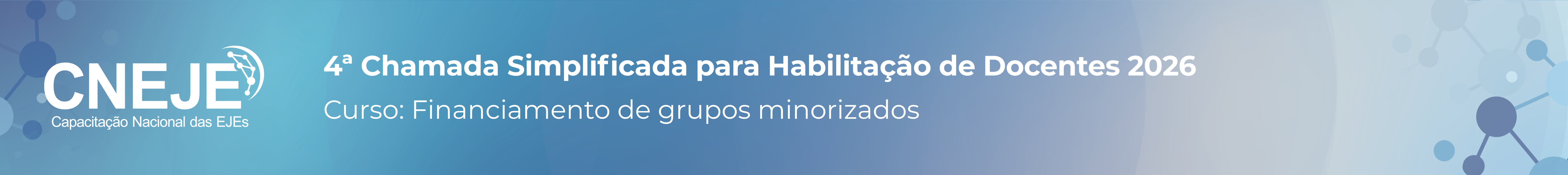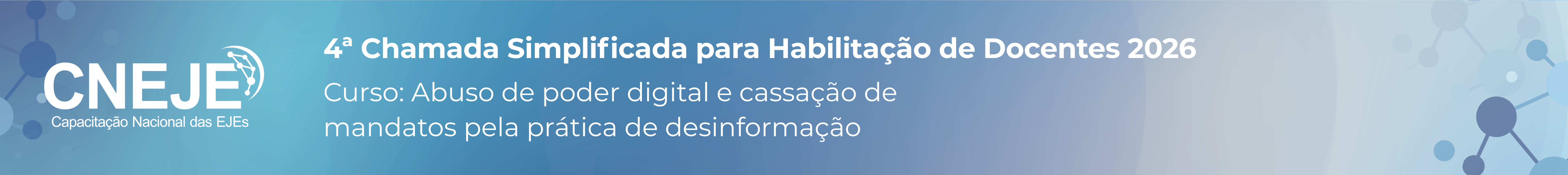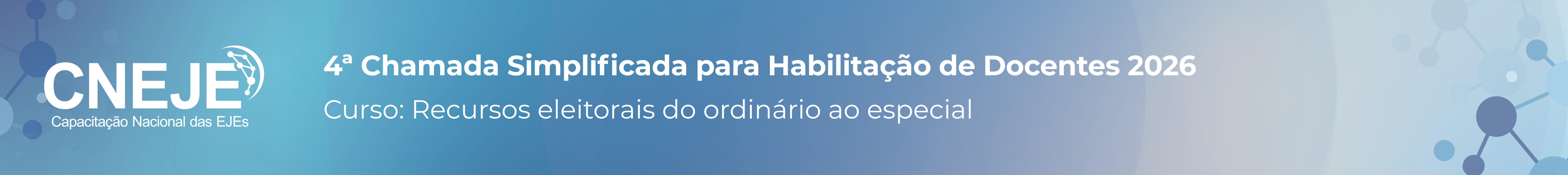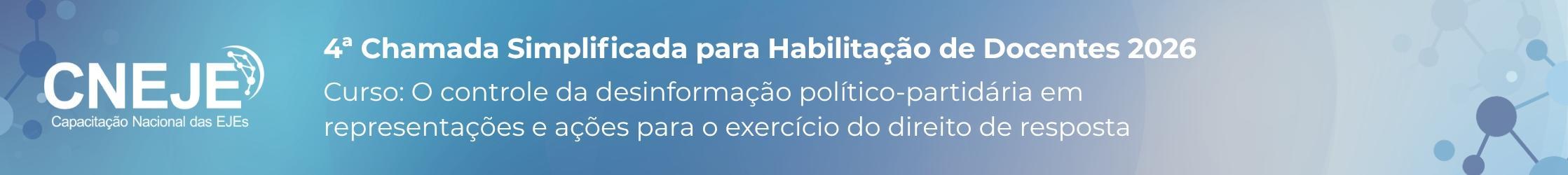 A Escola Judiciária Eleitoral do Tribunal Superior Eleitoral (EJE/TSE), no uso das atribuições conferidas pela Resolução TSE nº 23.620/2020, realiza CHAMADA SIMPLIFICADA PARA HABILITAÇÃO DE DOCENTES interessados em atuar no programa Capacitação Nacional das Escolas Judiciárias Eleitorais – CNEJE 2026.